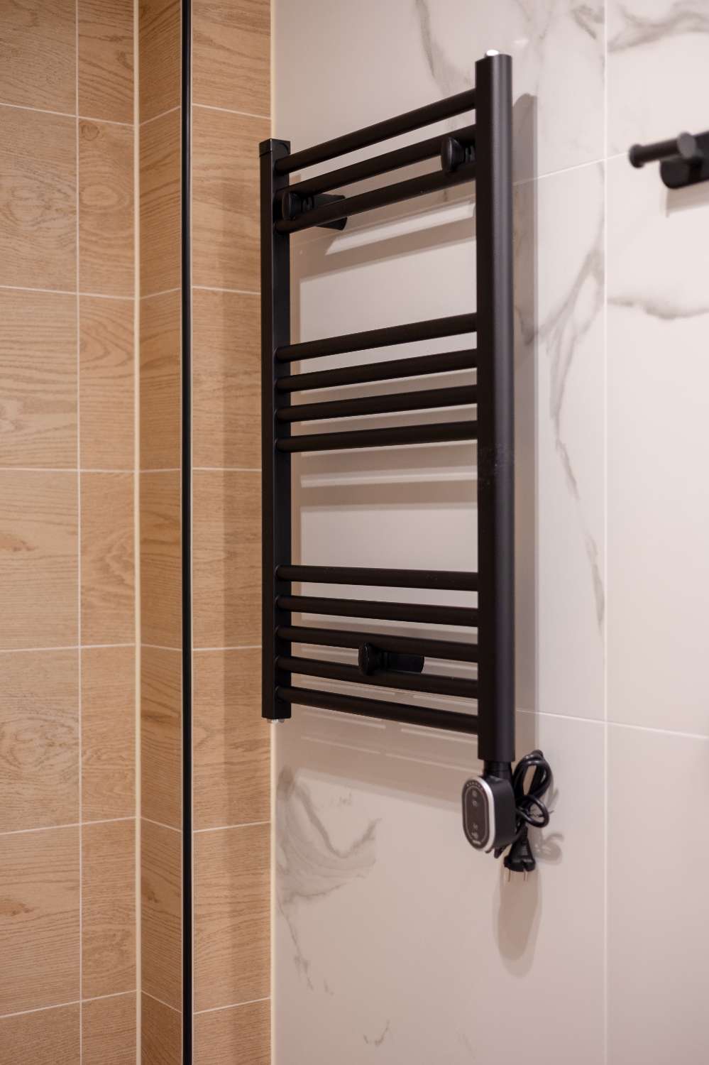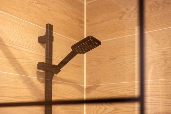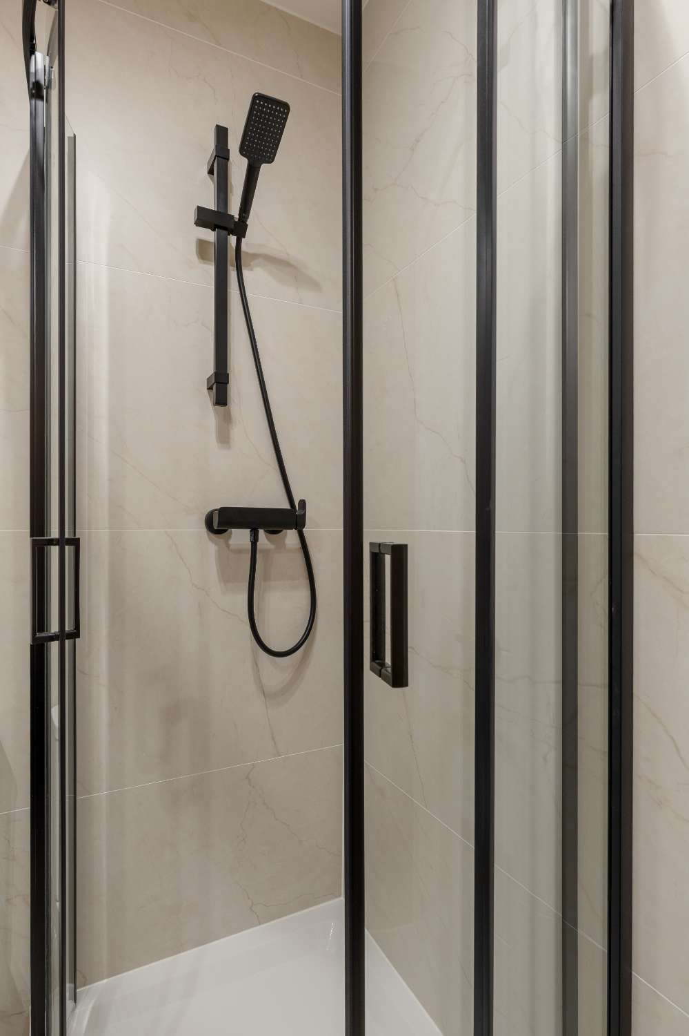 Second bathroom with large shower, electric water heater, new toilet, and elegant finishes