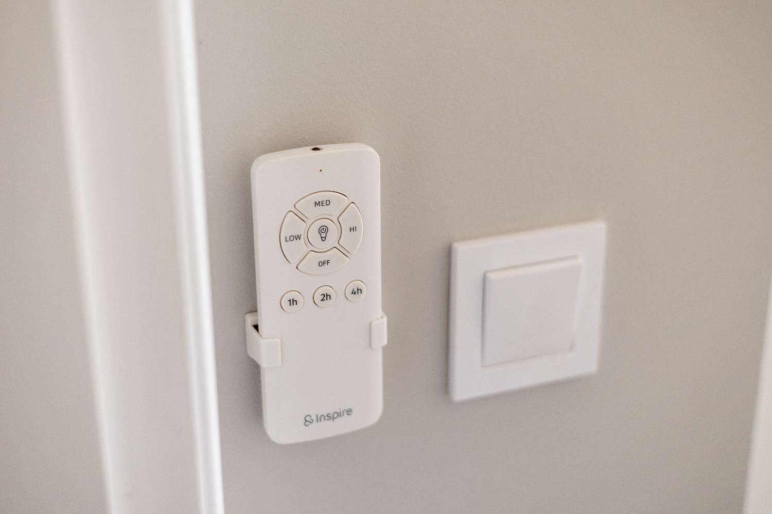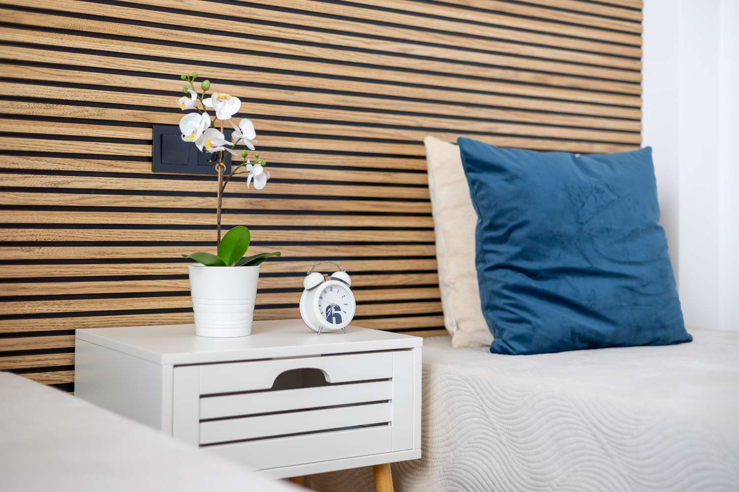 Bedroom 1: Double bed, bedside table, and wardrobe